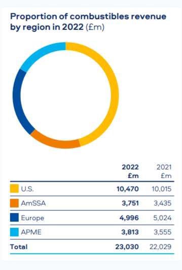 Nel 2022, British American Tobacco ha prodotto 605 miliardi di sigarette, in calo del 5,1% rispetto al 2021. Tuttavia, in termini di valore, i ricavi delle vendite di sigarette dell’azienda sono cresciuti del 4,5% a 23,03 miliardi di sterline. Nel primo semestre del 2023, la tendenza è continuata: l’azienda ha aumentato i ricavi delle vendite di sigarette dell’1,8%, mentre i ricavi da altri prodotti a base di tabacco da combustione sono cresciuti del 15,0% anno su anno. La regione di vendita più grande di British American Tobacco è gli Stati Uniti.
