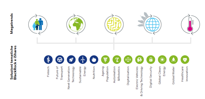 Ricorda che non puoi investire in un megatrend attraverso un solo prodotto. Per ovviare a questo limite, il famoso fondo BlackRock ha individuato una gamma di soluzioni tematiche attraverso le quali puoi esporti ai vari cambiamenti strutturali in atto. E’ questo uno dei modi a tua disposizione per investire con i megatrend oggi.