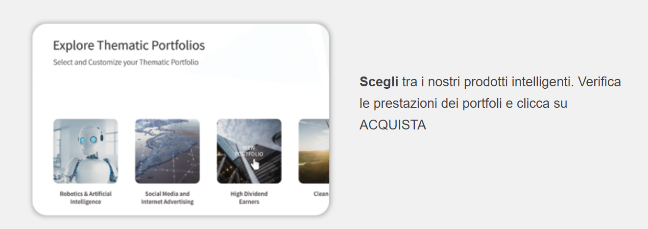 Il primo pasaggio è quello della scelta del portafoglio tematico su cui investire. Per individuare l’asset di tuo interesse non devi far altro che che navigare la directory. Puoi scegliere un portafoglio in base al suo rendimento (messo in debito risalto da percentuali e da grafici) oppure perchè reputi di avere informazioni che ti inducono a pensare che quel paniere potrebbe registrare un forte rialzo.